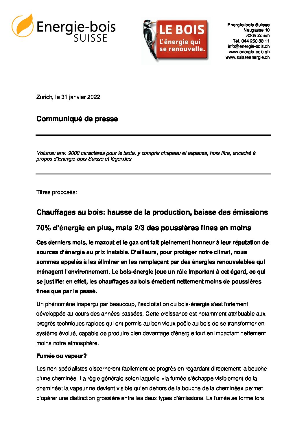 Ces derniers mois, le mazout et le gaz ont fait pleinement honneur à leur réputation de sources d’énergie au prix instable. D’ailleurs, pour protéger notre climat, nous sommes appelés les éliminer en les remplaçant par des énergies renouvelables qui ménagent l’environnement. Le bois-énergie joue un rôle important à cet égard, ce qui se justifie: en effet, les chauffages au bois émettent nettement moins de poussières fines que par le passé.
