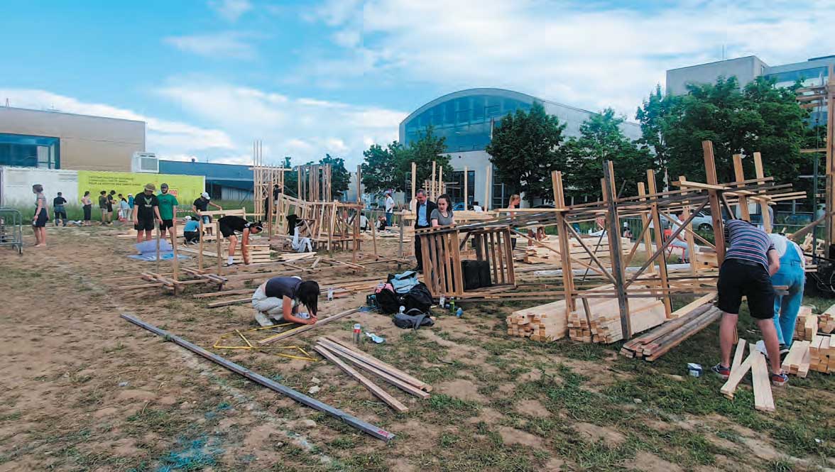 L’année académique trouve son point culminant lors de la construction en extérieur, généralement dans un lieu iconique, d’un projet en format 1 : 1 monté et vissé à la main par quelque 150 à 200 étudiants.