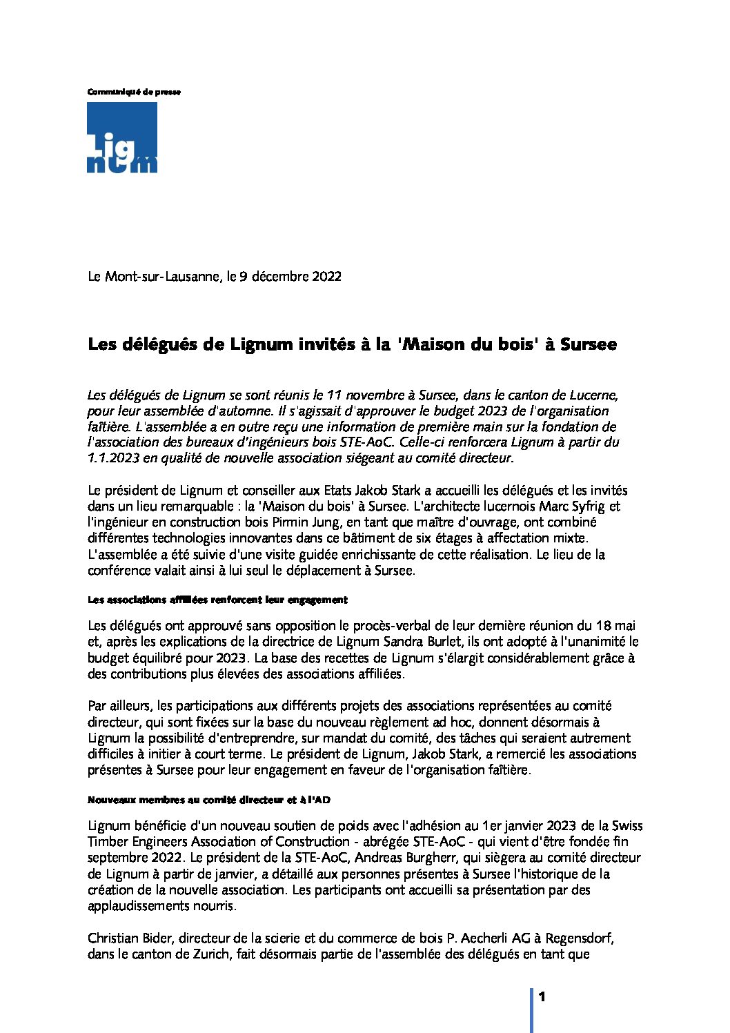 Les délégués de Lignum se sont réunis le 11 novembre à Sursee, dans le canton de Lucerne, pour leur assemblée d’automne. Il s’agissait d’approuver le budget 2023 de l’organisation faîtière.