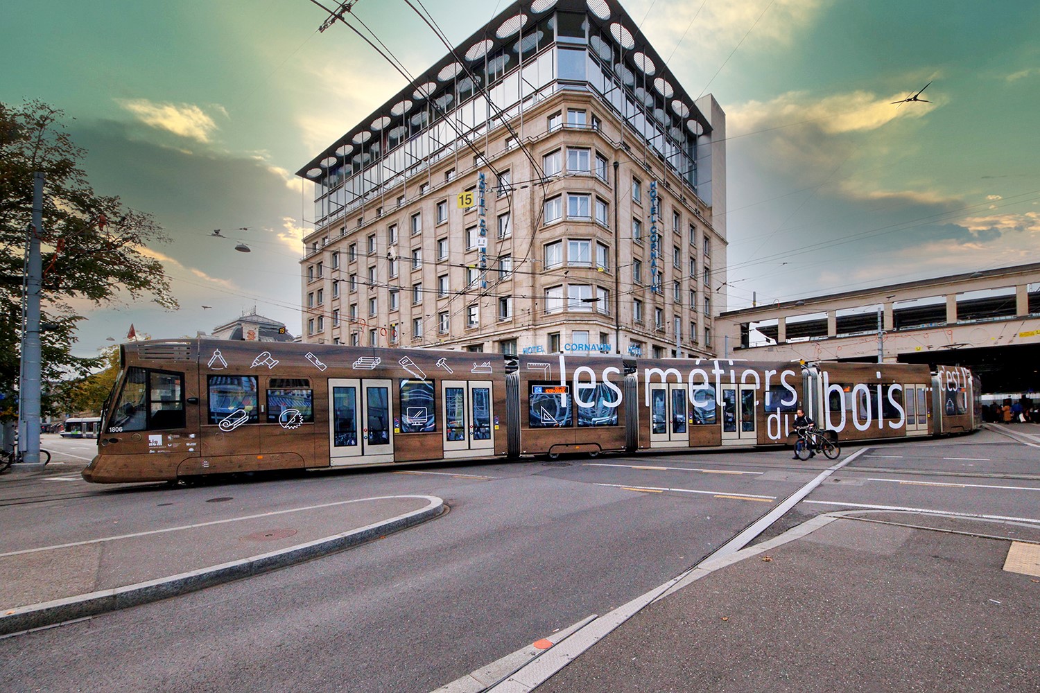 « Travailler le bois, c’est naturel » et « Les métiers du bois, c’est l’avenir », voilà les deux slogans qu’on peut lire sur le tram imitation bois qui circule sur les lignes genevoises depuis la mi-octobre.