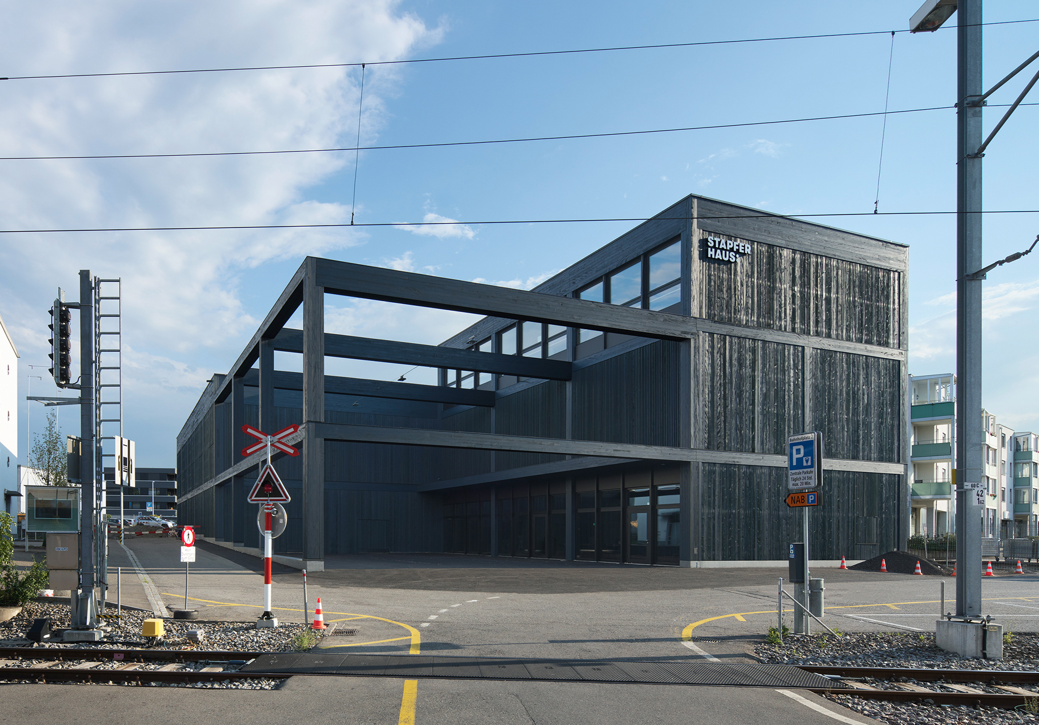 Les délégués de Lignum se sont réunis dans le nouveau bâtiment de la Stapferhaus de Lenzbourg, achevé en 2018 (maître de l’ouvrage : Fondation Stapferhaus, Lenzbourg ; architectes : Pool Architekten, Zurich ; ingénieurs bois : Makiol Wiederkehr, Beinwil am See ; construction bois : Zaugg, Rohrbach). Cette réalisation en bois a obtenu une mention dans la Région nord du Prix Lignum 2021. À l’exception des bureaux situés au dernier niveau, le bâtiment arbore à l’intérieur comme à l’extérieur des teintes sombres. Il se tient ainsi en arrière plan, telle une scène qui se met entièrement au service des contenus, et peut s’adapter à volonté pour leur diffusion.