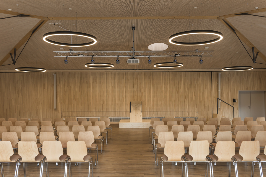 La salle polyvalente est posée dans le parc tel un écrin en bois. Elle s’ouvre généreusement sur l’extérieur et peut ainsi accueillir des manifestations diverses, formant tantôt une véritable salle de spectacle, tantôt un abri pour des manifestations en plein air. La scène est amovible et permet une multitude d’usages.