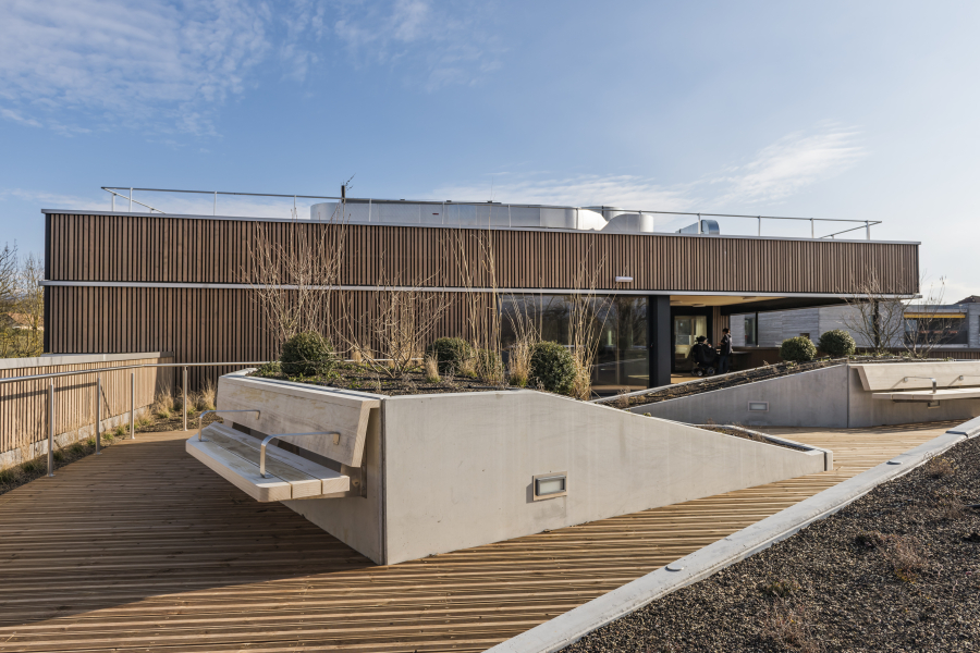 Les façades sont revêtues d’un bardage en mélèze reprenant la trame des plafonds acoustiques.