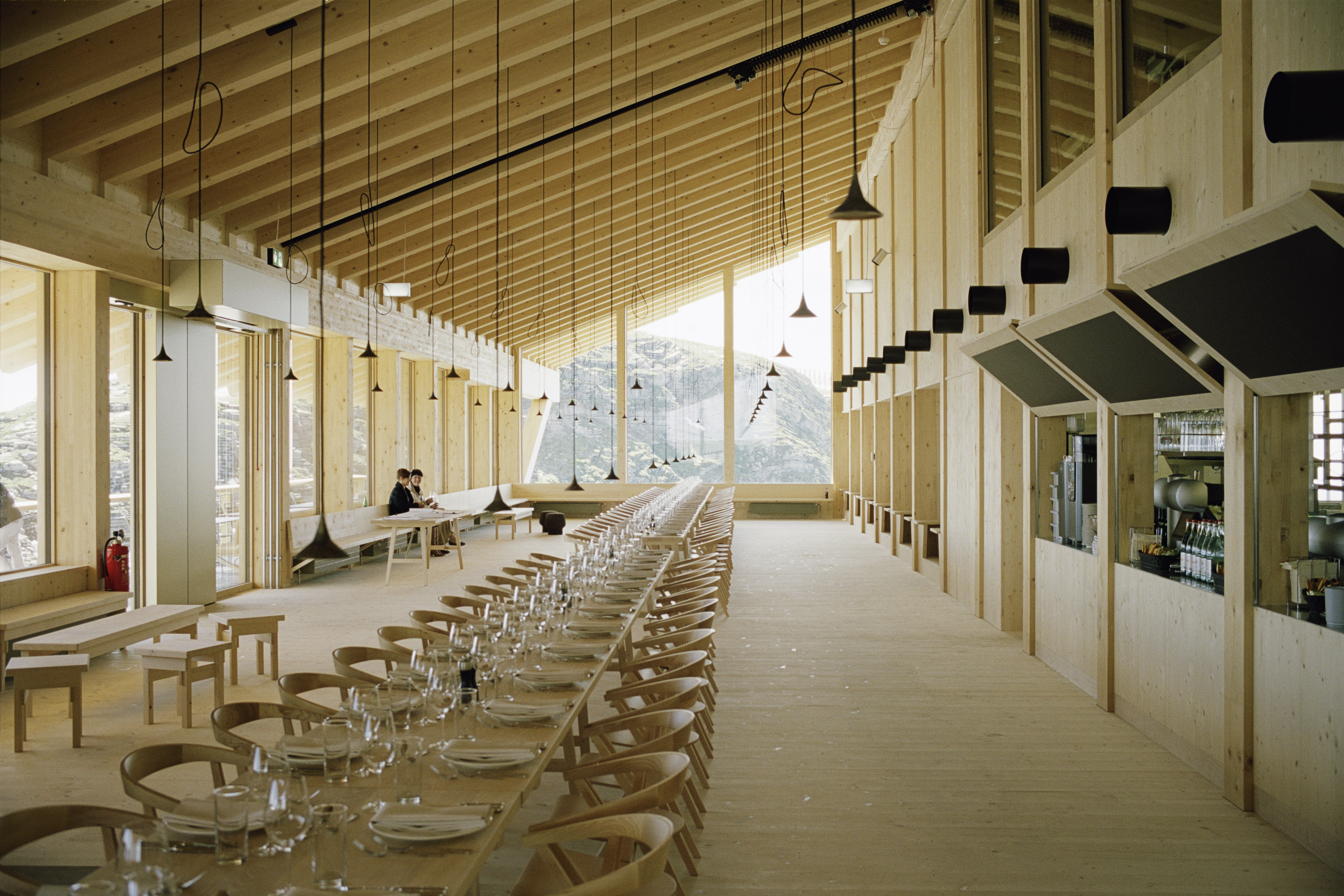 L’idée des architectes: rassembler. Ils ont ainsi accolé le nouveau restaurant directement contre l’ancienne station de tëléphérique et, en guise de protection, ëtendu la nouvelle façade en bois à la structure préexistante, effaçant ainsi toute trace des années 1970. Le rësultat est stupéfiant. Partant d’un mandat complexe, les architectes ont développé une forme nette et concise. Si le bâtiment oscille entre la grange, le chalet et la salle des télécabines, la toiture assure l’unité de l’ensemble.