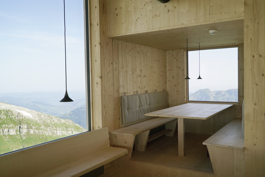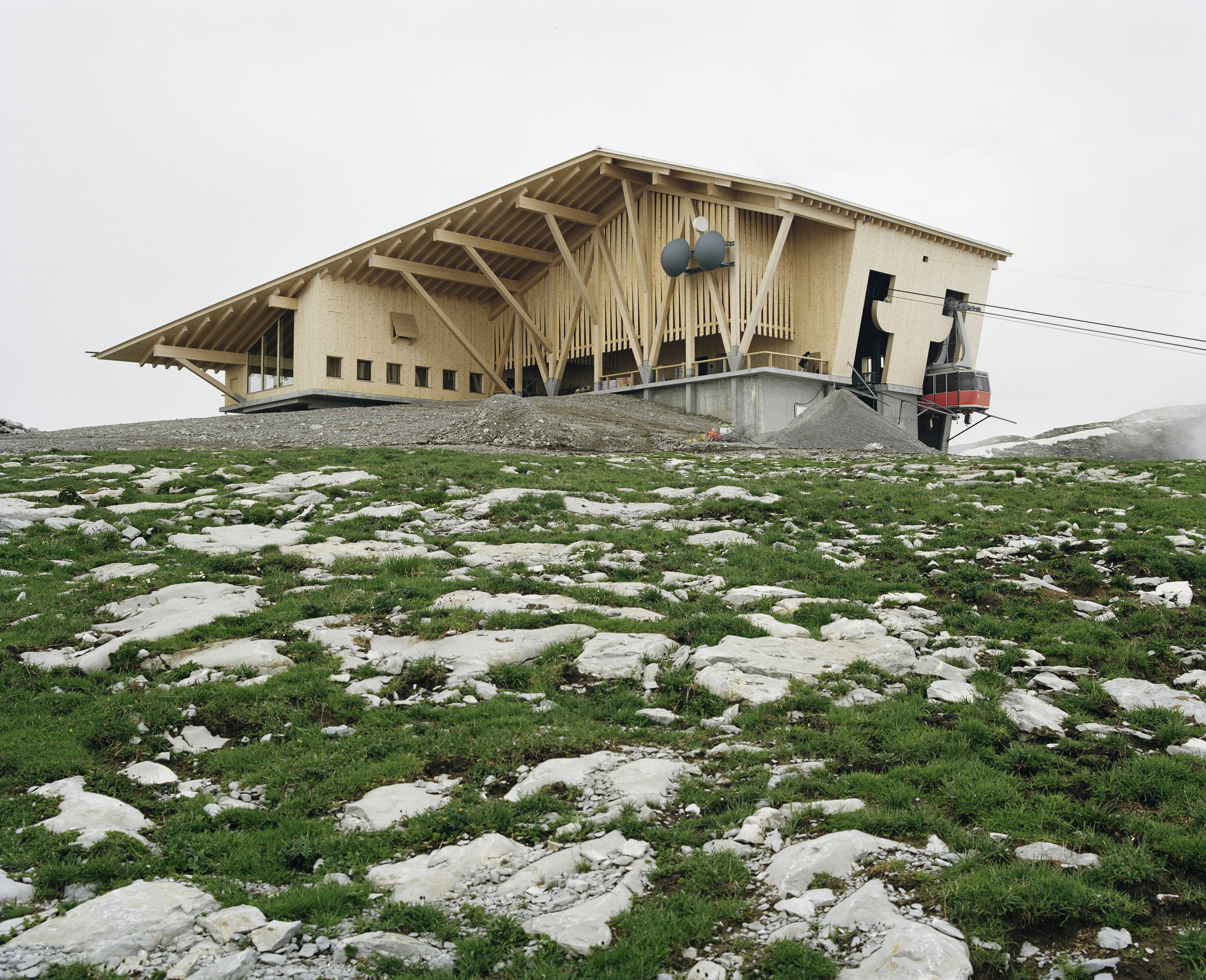 En atteignant le Chäserrugg â 2262 mëtres d’altitude, on ne peut que se frotter les yeux: porte-â-faux vertigineux, angles acérés, ënormes poutres ramifiées à la manière d’un arbre, le tout recouvert d’une imposante toiture en tôle. Le bâtiment ëlève l’art classique de la menuiserie vers de nouveaux sommets. Ce n’est ni un jumbo chalet ni une station arctique, mais une construction en bois dotée de son langage propre, de ses dimensions propres.