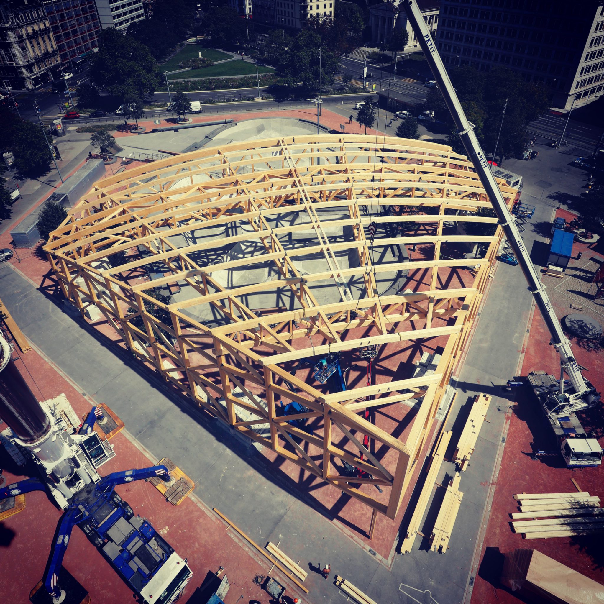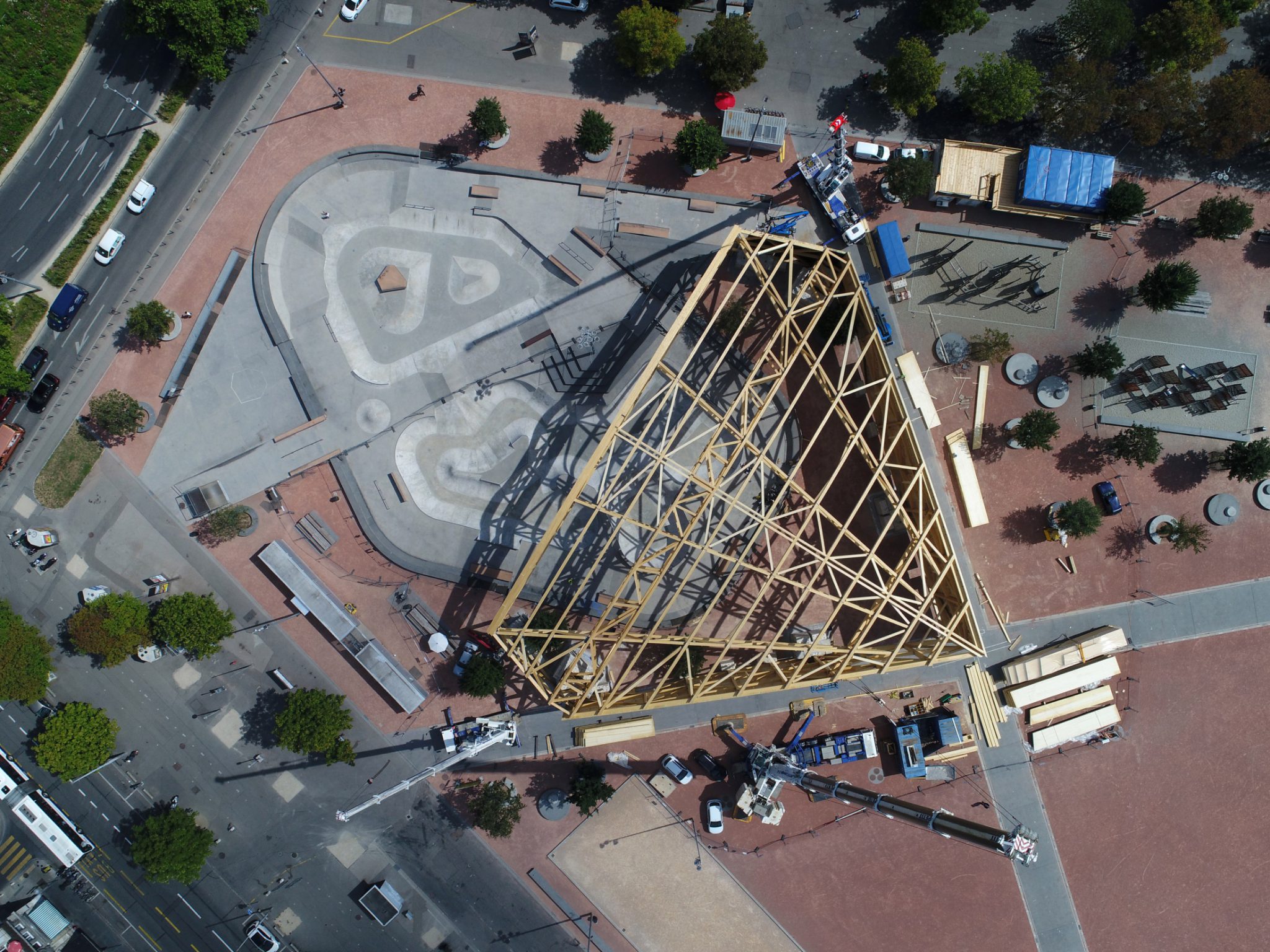 Conçue pour un évènement éphémère accueillant le spectacle ZUP de la Compagnie Urbaine, mêlant arts urbains et danse contemporaine, une structure en bois en forme de diamant a été implantée sur la plaine de Plainpalais.