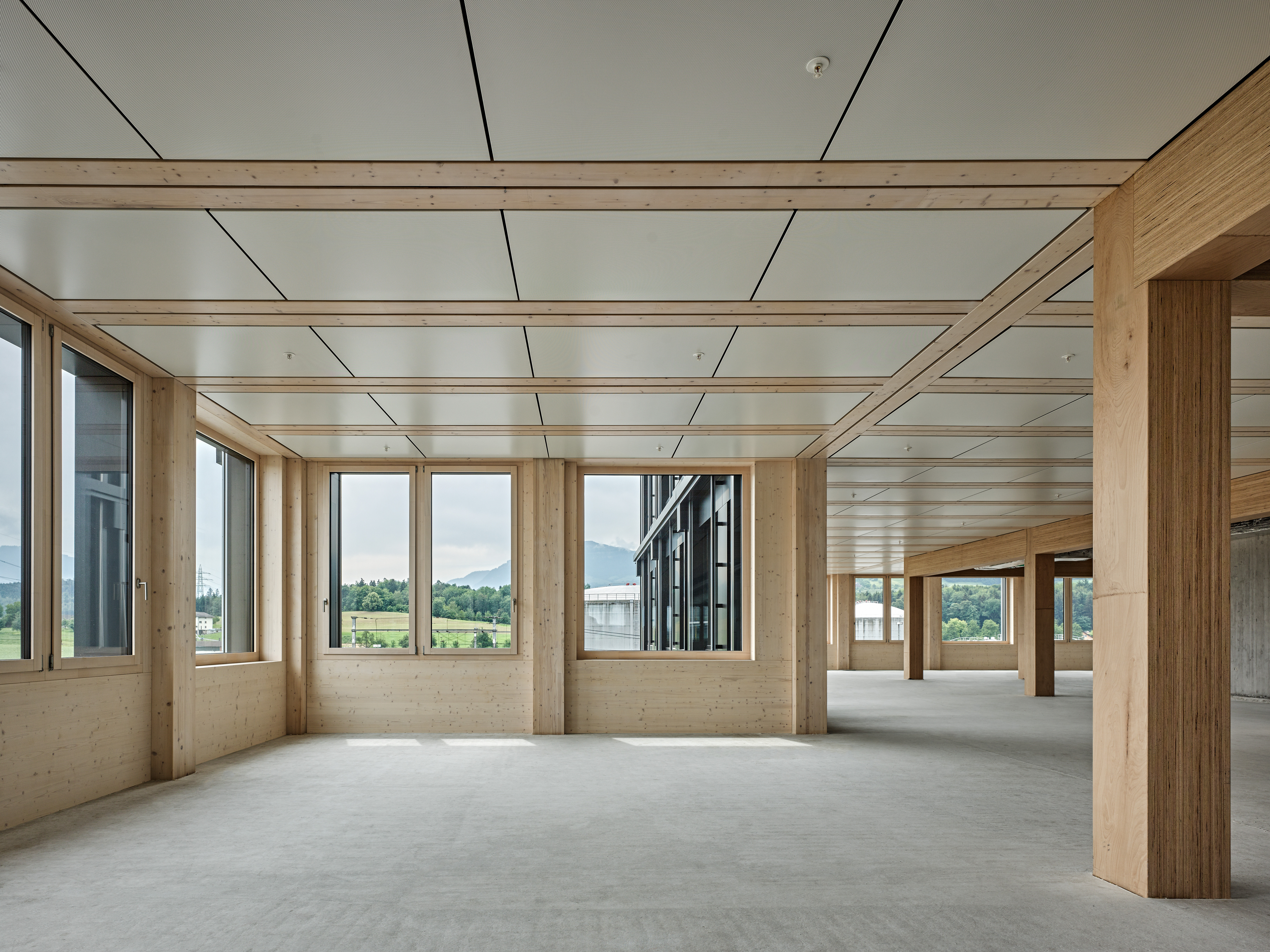 Elle montre à quel point les nouvelles normes de protection incendie ont repoussé les limites architecturales. Le bois peut désormais porter une tour, mals aussi se passer de revêtement. Le gros oeuvre définit les espaces avec une précision qui plaide en faveur de la préfabrication.